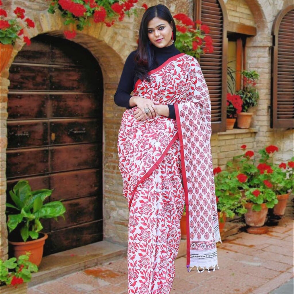 Check out this red and white combination block printed beautiful cotton saree that is soft and airy.