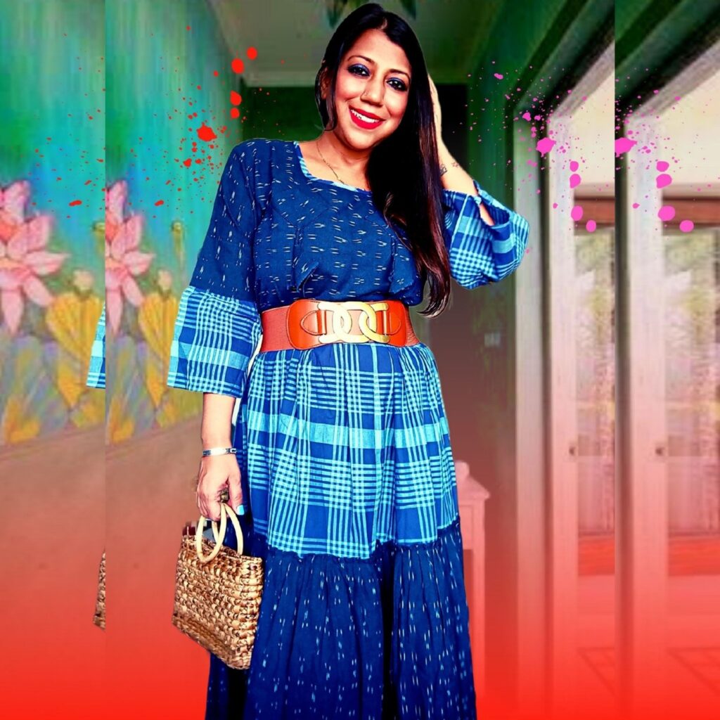 This Indigo Blue long-tiered dress is suitable for all body types and creates a beautiful silhouette with its pattern and flair. Shibori combined with checks elevates your look. This dress can be styled with anumber of accessories such as a sling bag, oxidised jewellery or a broad belt like our model. . This is a great option for casual wear, made in pure organic cotton. Shop this outfit at https://aaikialmirah.in/product/Indigo-Blue-Tiered-Long-Dress