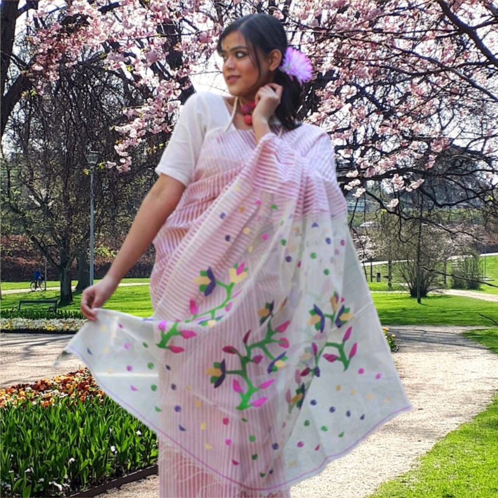 Any Indian woman’s wardrobe is incomplete without a saree. Saree has always been here since ancient times. Trends and fashion keep changing but saree are forever. Sarees are unbeatable when it comes to sustainability, the handloom and handmade sarees are always in, even the vintage ones are also loved and worn. At a time Muslin was the finest fabric ever made. It was so fine that it would pass through a ring or fit in a matchbox. Due to some unfateful incidents, the art of making fine muslin was put to end. But Muslin never lost its charm. Pure muslin is made out of finest cotton fibre on handloom. Designs are woven on the handloom. A muslin saree is a prized possession and can survive decades if kept carefully. Check out this beautiful Aai ki Almirah Muslin saree in pink and white handloom muslin. https://aaikialmirah.in/product/My-Fair-Lady-in-White—Pink-Handloom-Muslin